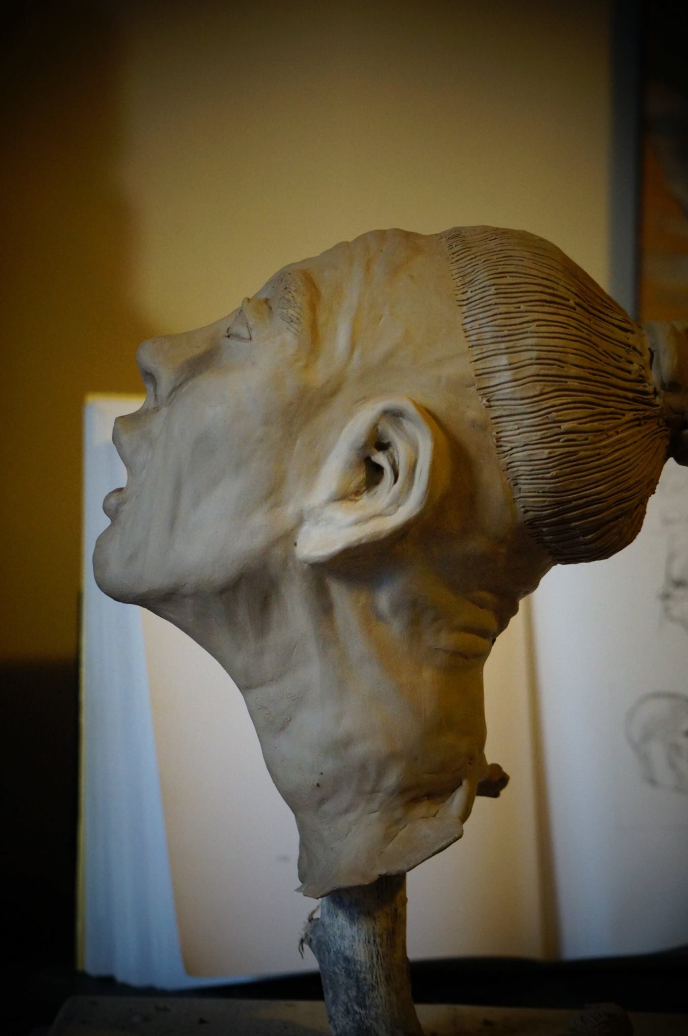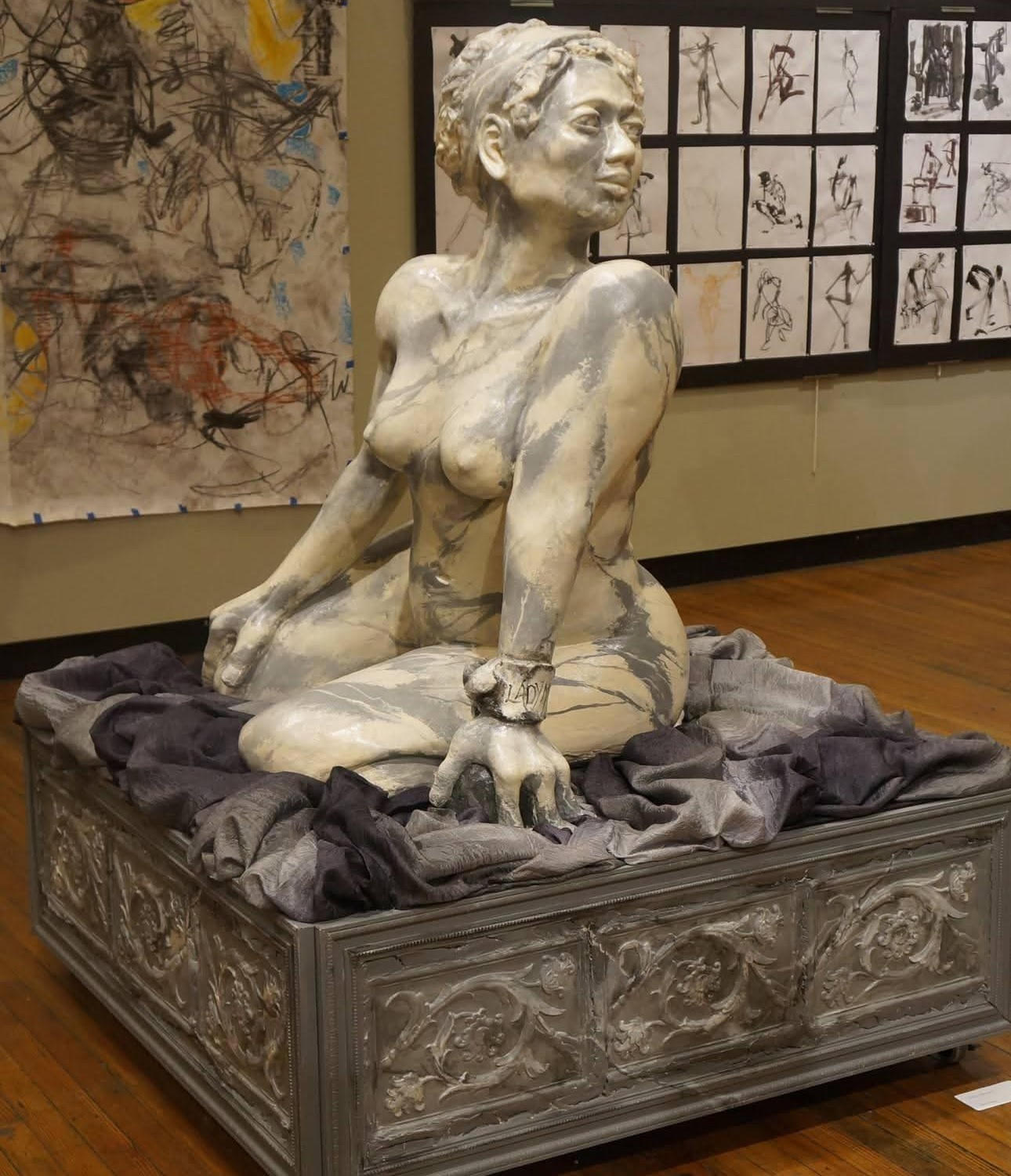 Lady Mabelle’s piece showcased in an exhibit at The Art Students League in Manhattan, New York. The masterpiece material is cast in Hydrocal. The platform that it sits on is custom made by herself with intricate details in plaster.